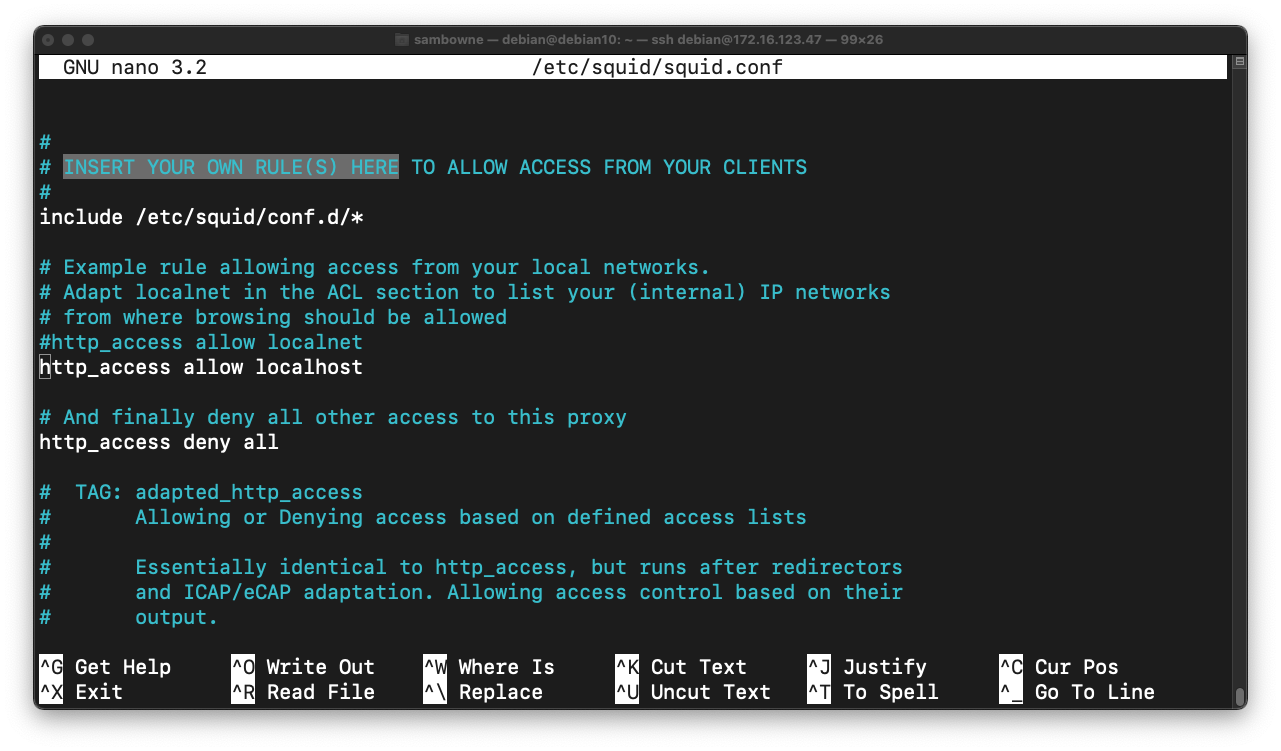 Above the "http_access allow localhost" line, insert these two lines, outlined in yellow in the image below.