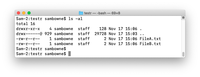You see the two files "FileA.txt" and "FileB.txt", as well as the two system-generated files "." and "..", as shown below.ls -al
