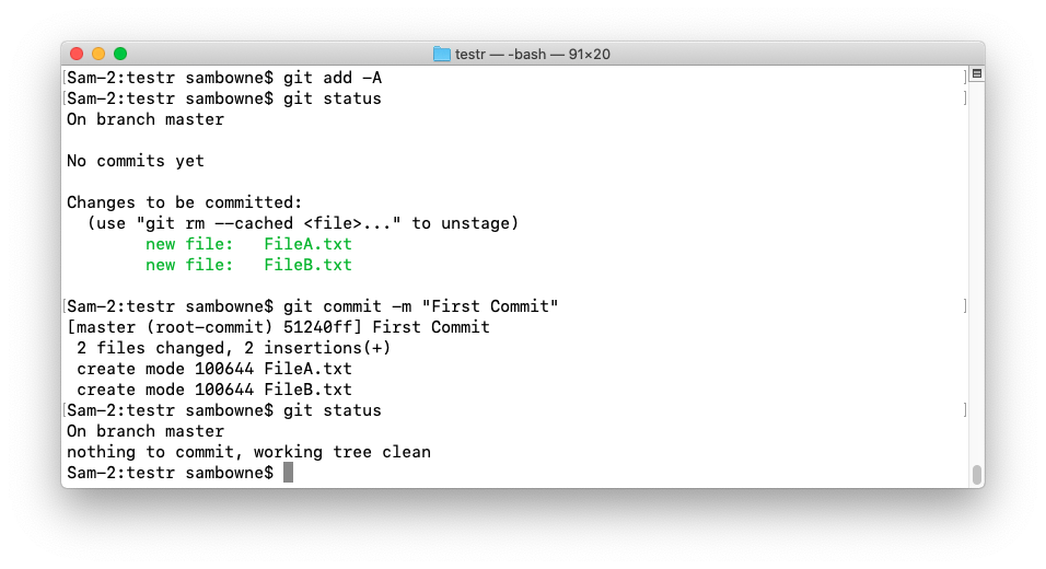 This adds the files to your local git repository, as shown below.git add -A git status git commit -m "First Commit" git status