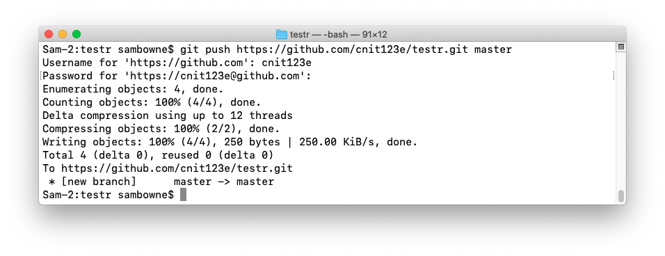 Enter your username and password when you are prompted to.git push https://github.com/cnit123e/testr.git master