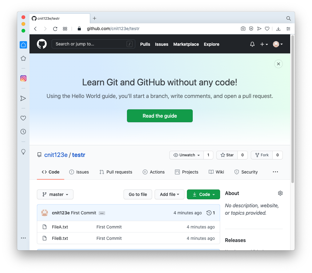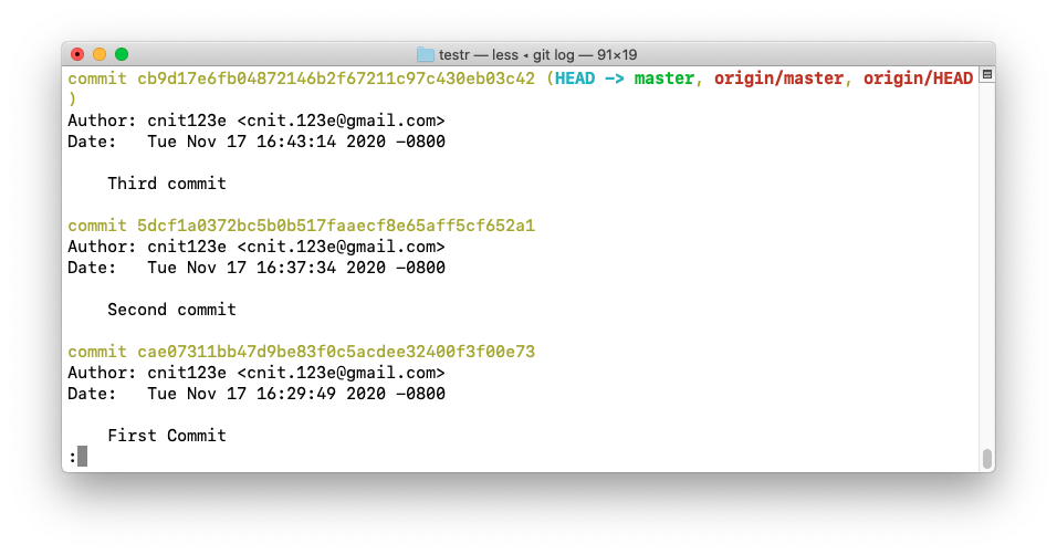 You see the three commits, named "Third commit", "Second commit", and "First commit", as shown below.cd mkdir testr2 cd testr2 git clone https://github.com/cnit123e/testr.git cd testr git log