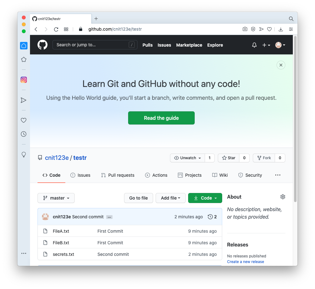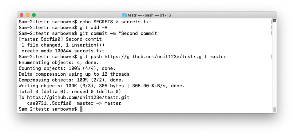 The files are uploaded, as shown below.echo SECRETS > secrets.txt git add -A git commit -m "Second commit" git push https://github.com/cnit123e/testr.git master