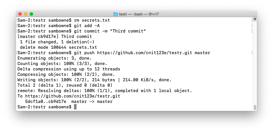 The files are uploaded, as shown below.rm secrets.txt git add -A git commit -m "Third commit" git push https://github.com/cnit123e/testr.git master