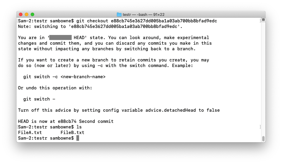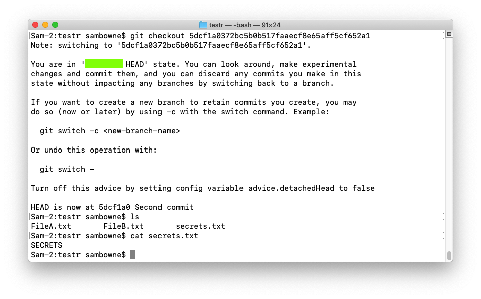 The secrets.txt file is gone, as shown below.git checkout e88cb745e3627dd005ba1a03ab700bb8bfad9edc ls