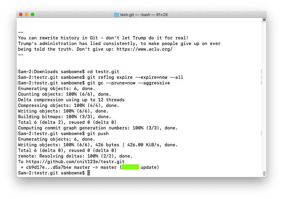 cd cd Downloads git clone --mirror https://github.com/cnit123e/testr.git java -jar bfg-1.13.0.jar --delete-files secrets.txt testr.git cd testr.git git reflog expire --expire=now --all git gc --prune=now --aggressive git push