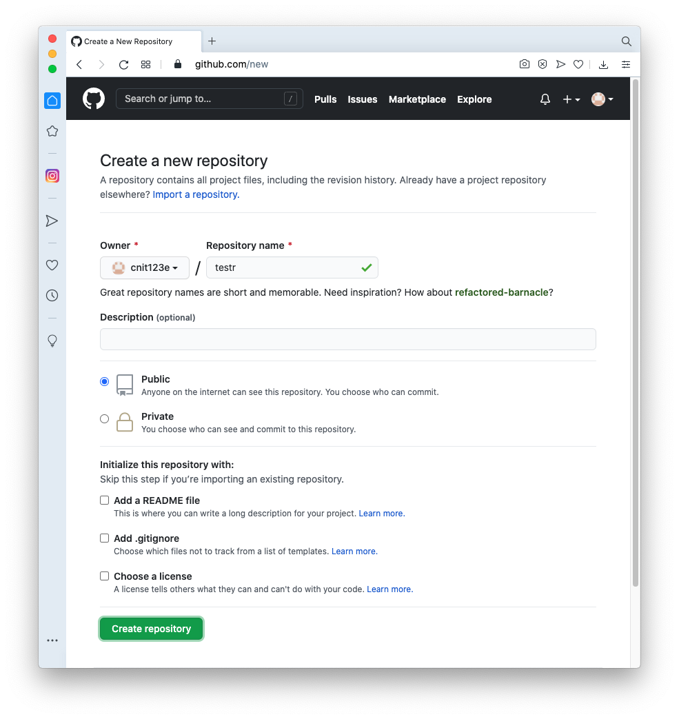 Accept the default values and, at the bottom, click the green "Create repository" button.