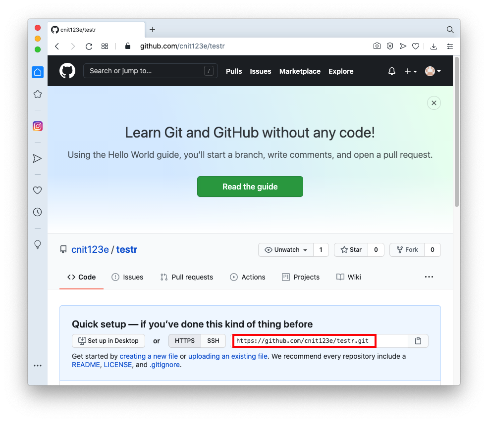 The next page shows the URL of your repository, outlined in red in the image below. Copy this URL to the clipboard.