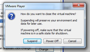 Suspend freezes your VM in its current state. This is usually the best choice.