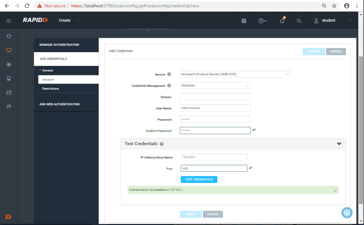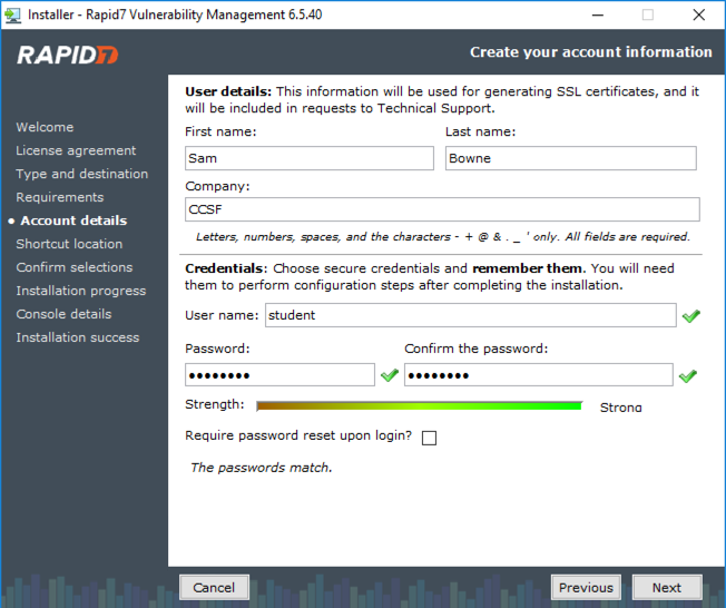 You'll have to make an account, as shown below. I recommend a username of student and a password of P@ssw0rd
