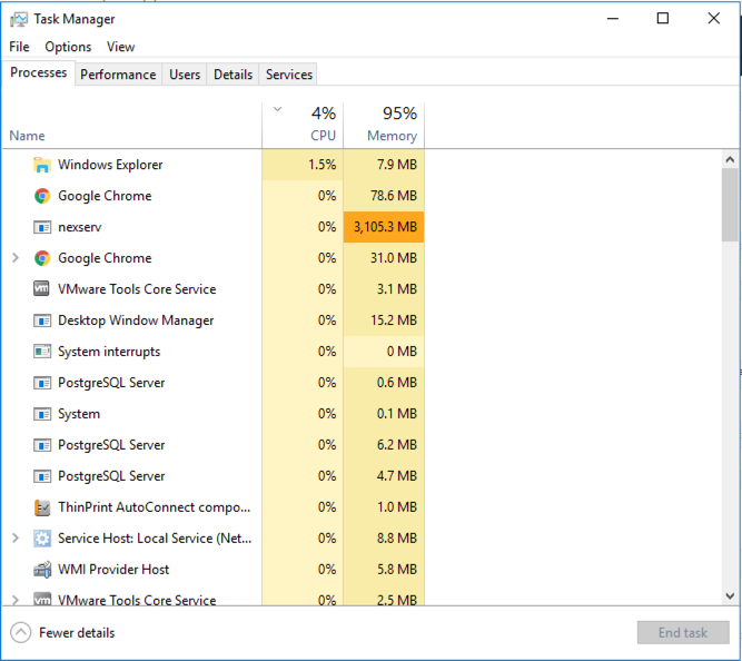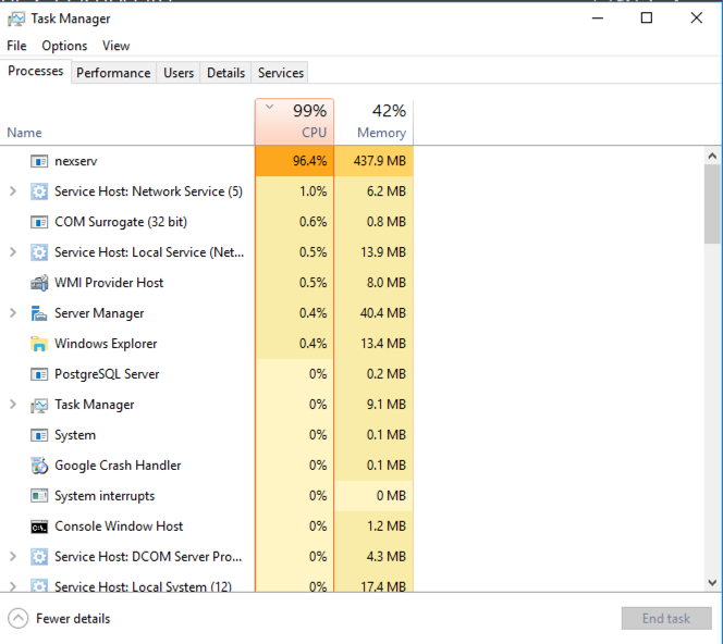 Task Manager will show the "nexserv" process consuming all available CPU, as shown below.
