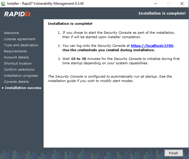 The last screen tells you how to connect to the product, and warns you that it may take 30 minutes to finish setup, as shown below.