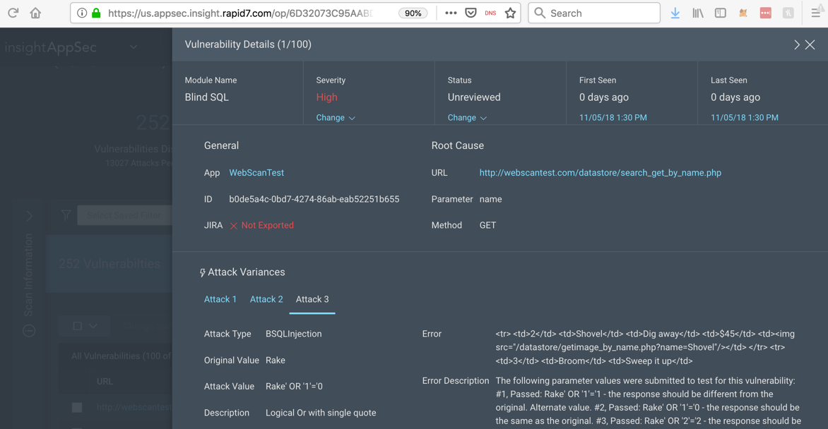 Click the first item, with a Module Name of "Blind SQL". Details of the vulnerability appear, as shown below.