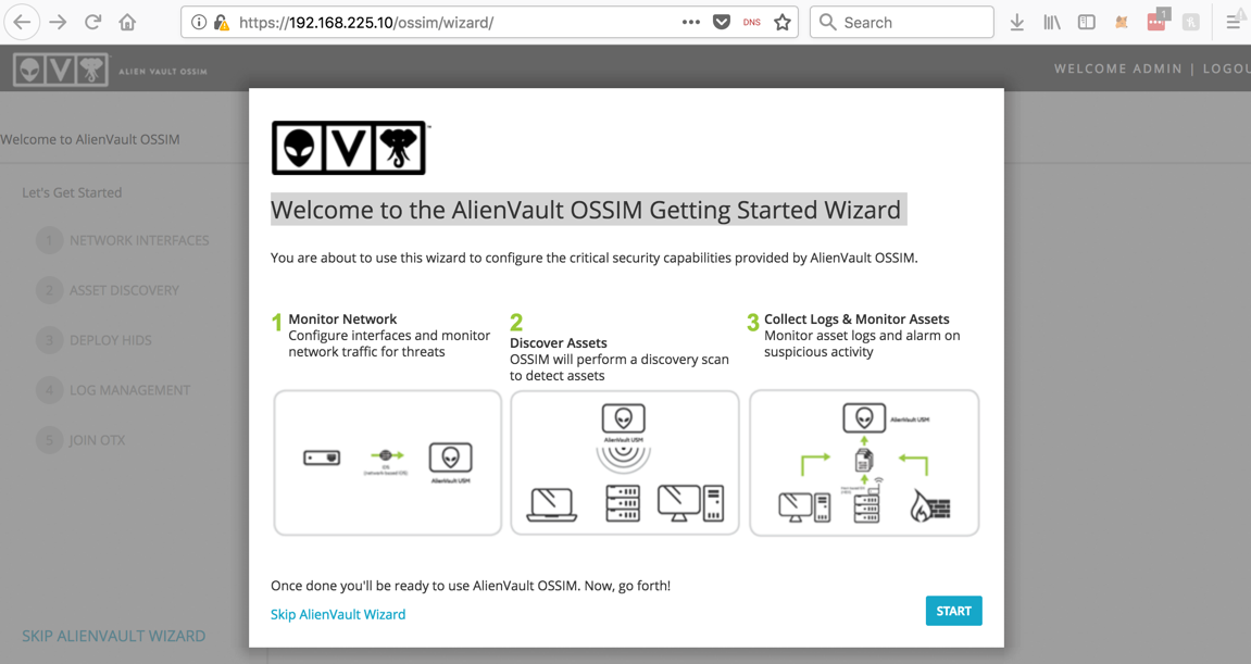 In the "Welcome to the AlienVault OSSIM Getting Started Wizard" page, click START, as shown below.