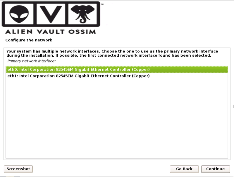 At the "Configure the network" screen, accept the default selection of eth0, as shown below, and click Continue to select the default of "American English".