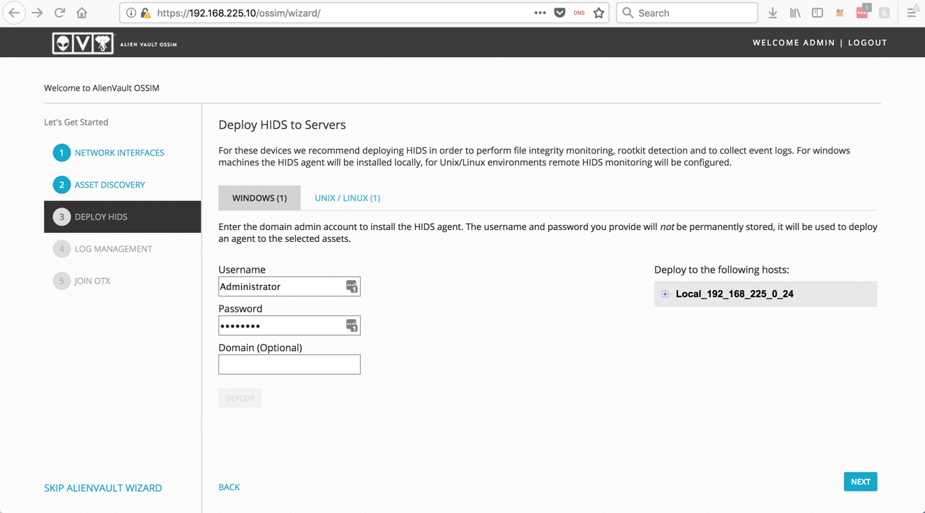 In the "Deploy HIDS to Servers" page, enter your Windows credentials, as shown below.