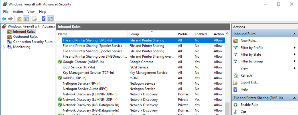 In the center pane, click "File and Printer Sharing (SMB-In)" to highlight it, as shown below.