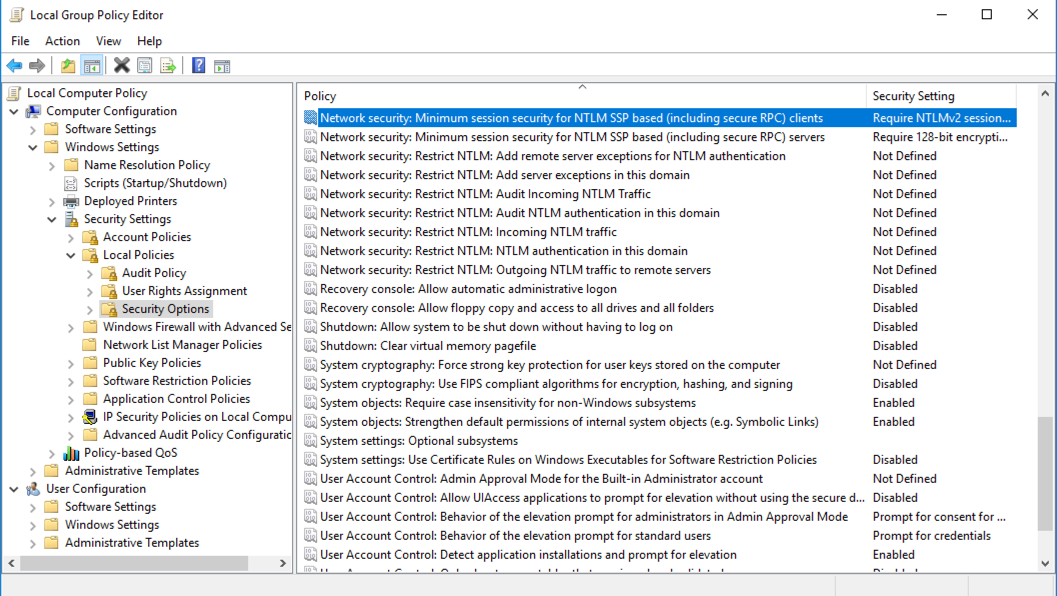 In Local Group Policy Editor, in the right pane, double-click "Network Security: Minimum session security for NTLMSPP based (including secure RPC) servers".