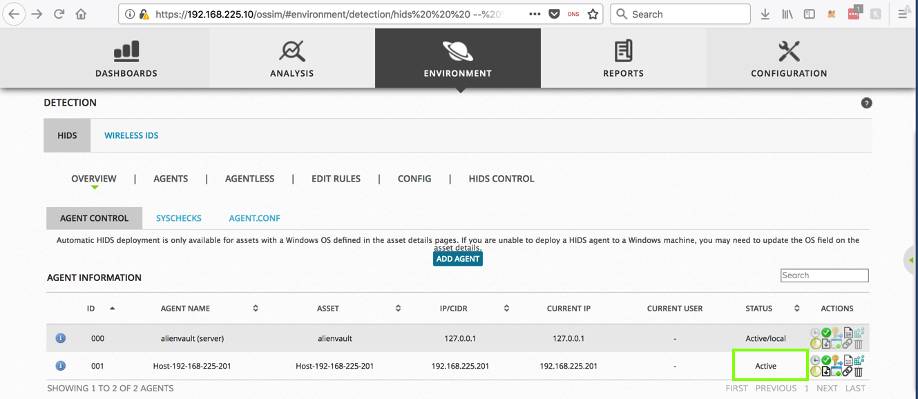In the AlienVault Web page, the agent should change to "Active", as shown below, after a minute] or two. If it does not, try clicking the clockface icon to restart the agent.