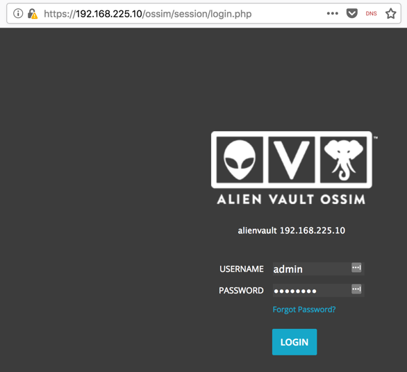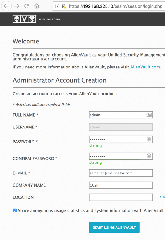 Fill out the form, using a name of admin and a password of P@ssw0rd, as shown below, and click "START USING ALIENVAULT".