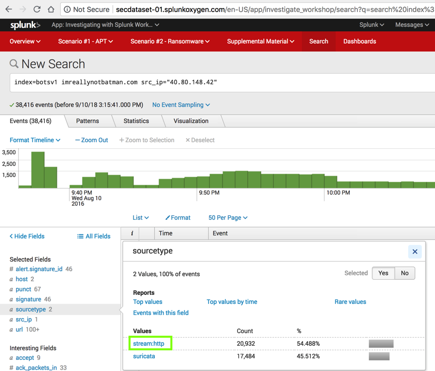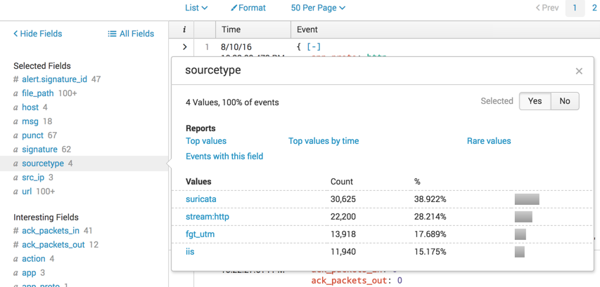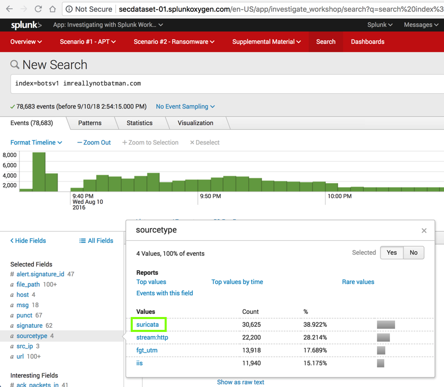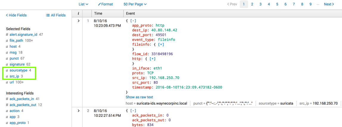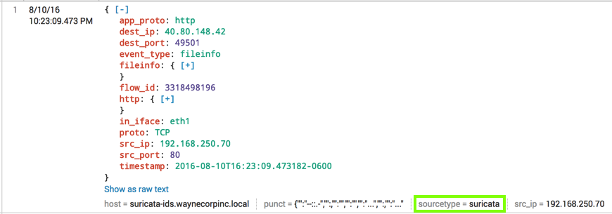 In the "sourcetype" box, click suricata, which is outlined in green in the image above.