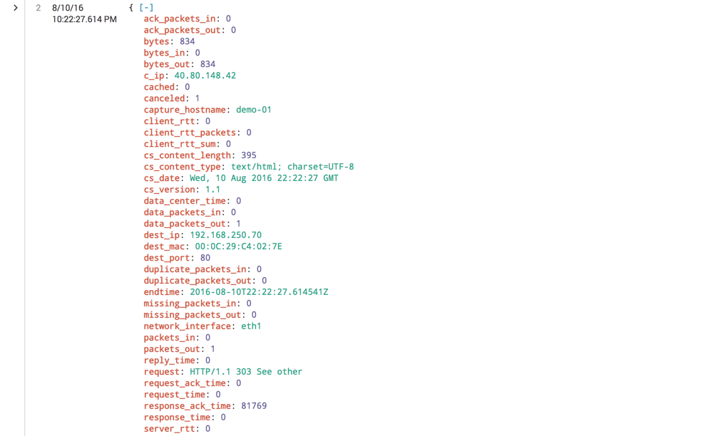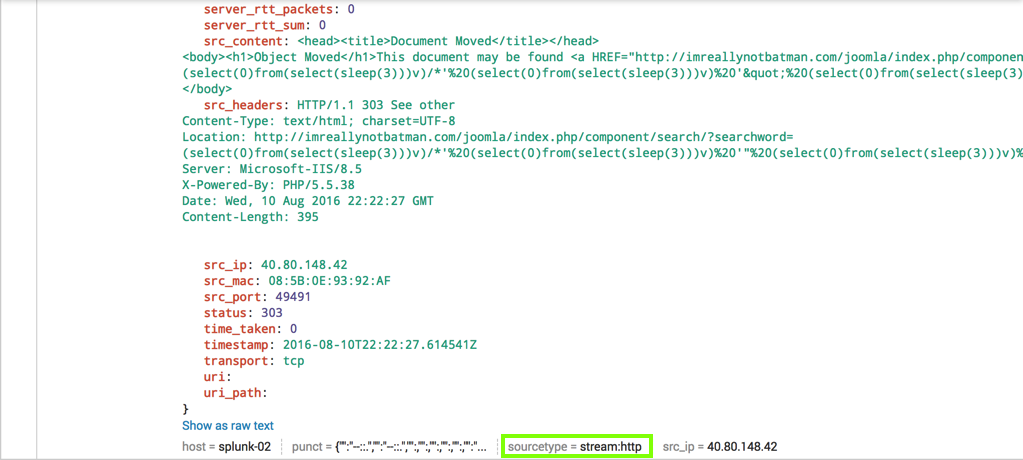 Scroll down and examine event 2, as shown below. There's a lot of data here, from a source of "strem:http". It contains IP addresses, MAC addresses, the HTML source of the response (in the src_content field), the HTTP headers (in the src_headers field), and more.