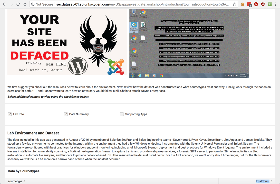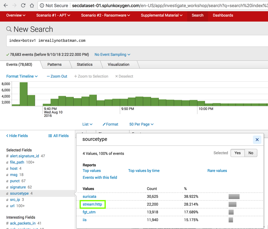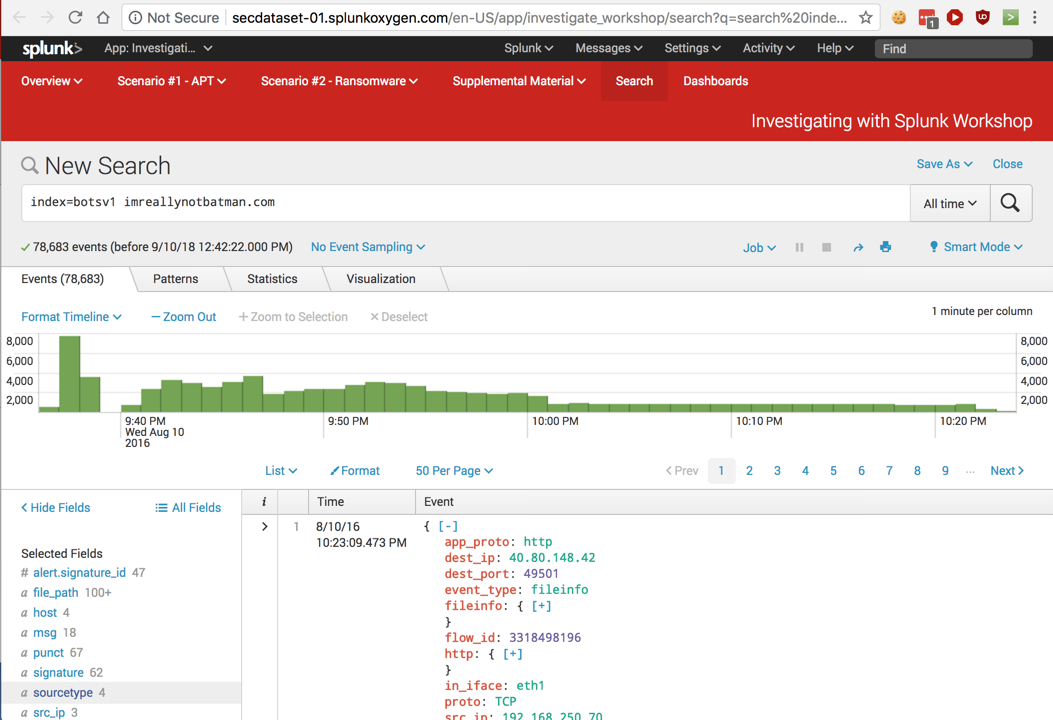 After a few seconds, Splunk finds all 76,683 events including the text "imreallynotbatman.com", as shown below.
