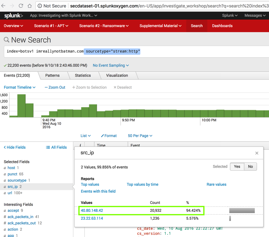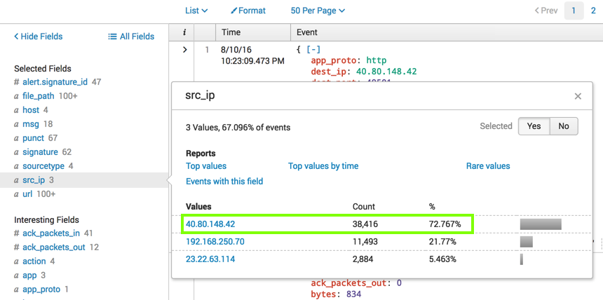 The IP "40.80.148.42" is the source for 94% of the HTTP events, as shown below.