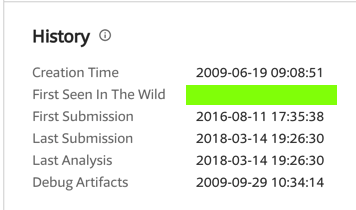 Search VirusTotal.com and find the date that file first was seen in the wild, which is covered by a green box in the image below.
