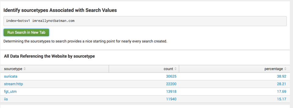 On the next page, in the "Identify sourcetypes Associated with Search Values" section, click click the green "Run Search in New Tab" button, as shown below.