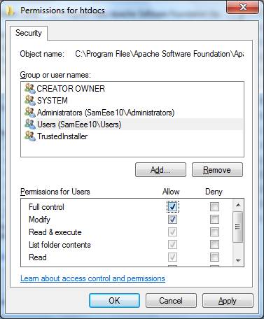 6. In the "htdocs Properties" box, click the Security tab. Click the Edit button. In the "Permissions for htdocs" box, click "Users" to select it. In the "Allow" column, in the "Full Control" row, click the check box, as shown to the right on this page. Click OK. Click OK.