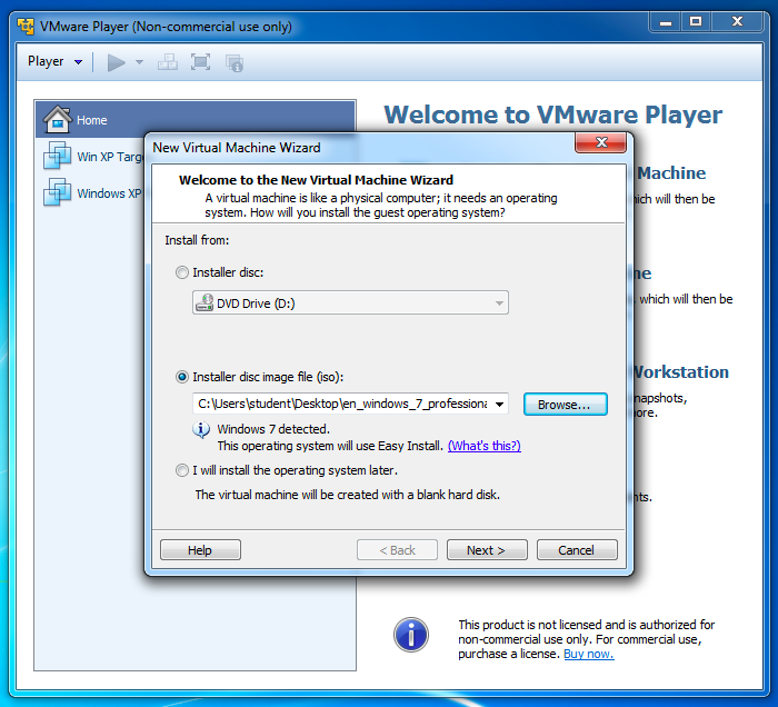 In the "New Virtual Machine Wizard", select one of the top two options, to tell VMware where your Windows 7 installation medium is.