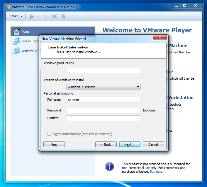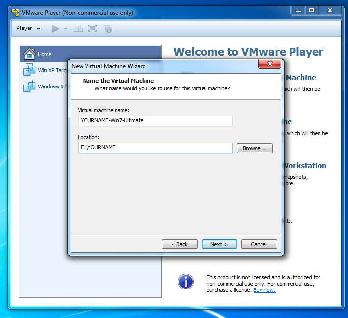 In the next screen, enter a "Virtual machine name" of YOURNAME-Win7-Ultimate, as shown below. Don't use the literal text "YOURNAME"--replace that with your own name.