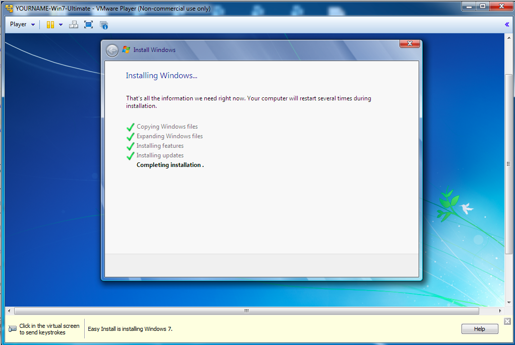 The installation proceeds automatically, as shown below. You will probably have to click through a few warning boxes VMware pops up when the machine starts.