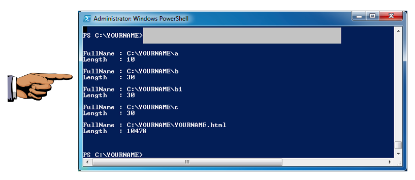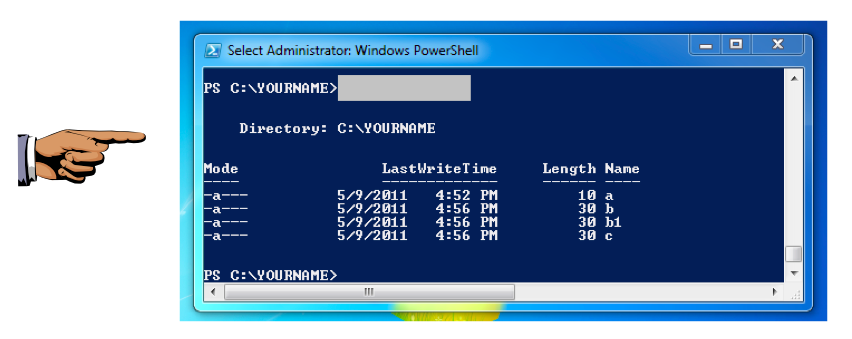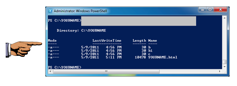 Open Powershell and get a list of all the files in the C:\YOURNAME directory.