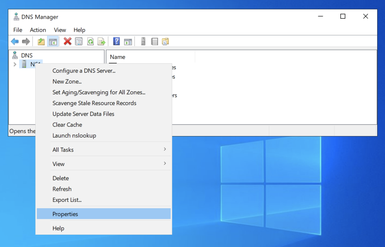 In "DNS Manager", on the left side, left-click your server to highlight it. Then right-click your server and click Properties, as shown below.