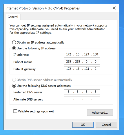 Set the DNS Server field to 8.8.8.8 as shown below, and click OK.