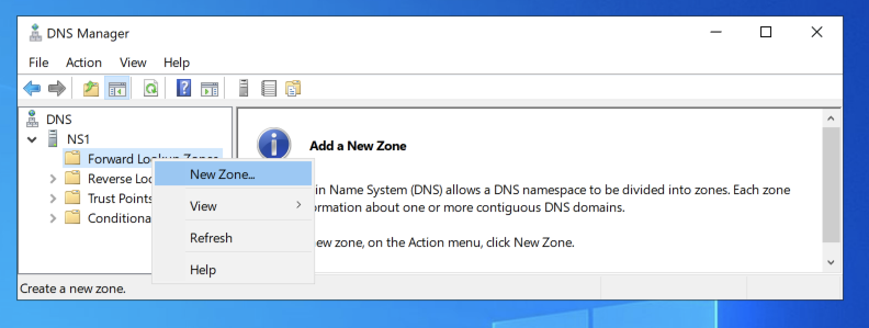 Then right-click "Forward Lookup Zones" and select "New Zone...", as shown below.