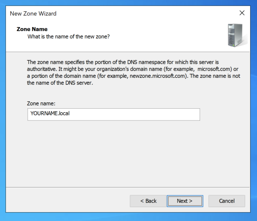 In the "Zone File" page, accept the default selection to create a new file named "YOURNAME.local.dns" and click Next.
