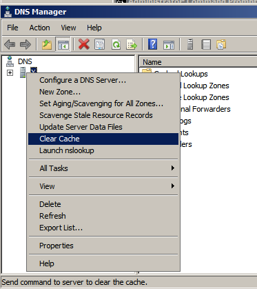In "DNS Manager", on the left side, right-click your server and click "Clear Cache", as shown below.