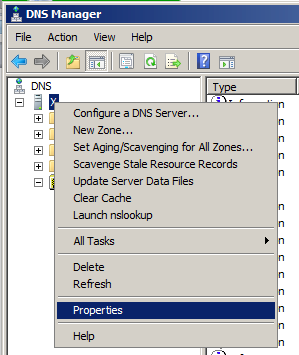 In "DNS Manager", on the left side, right-click your server and click Properties, as shown below.