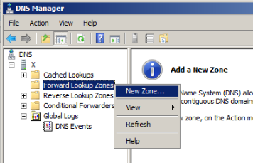 In DNS Manager, in the left pane, right-click "Forward Lookup Zones" and select "New Zone...", as shown below.
