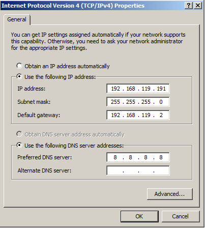 Set the DNS Server field to 8.8.8.8 as shown below, and click OK.