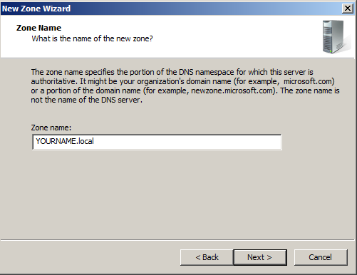 In the "Zone File" page, accept the default selection to create a new file named "YOURNAME.local.dns" and click Next.