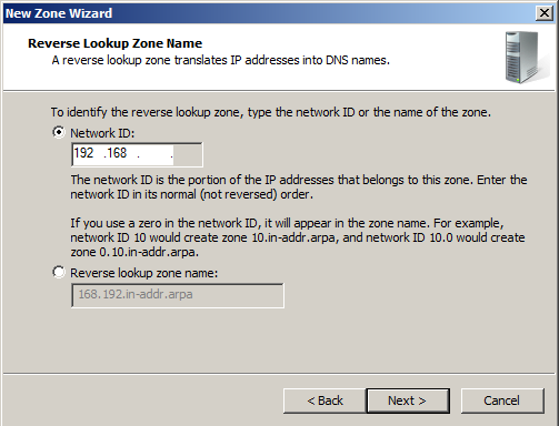 In the "Reverse Lookup Zone Name" page, enter a Network ID of