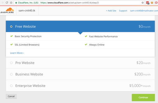 On the next page, select the free plan, as shown below, and click the green Continue button.