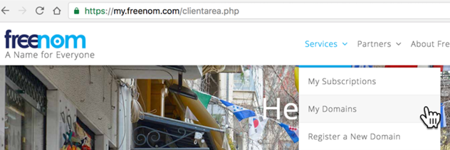 The "freenom" page opens. Click Services, "My Domains", as shown below.