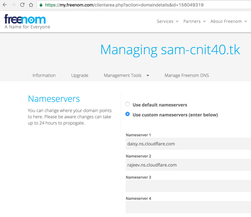 On the next page, click the "Use custom nameservers (enter below)" button, and adjust the nameservers as you were instructed to by cloudflare. The final result should be similar to the image shown below.