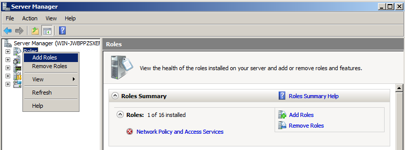 On the left side, right-click Roles and click "Add Roles..." as shown below: