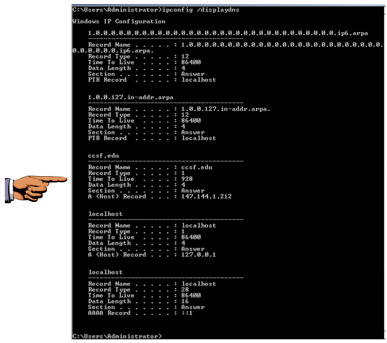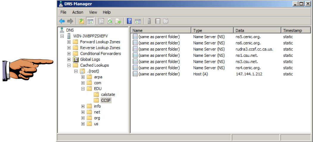 If there is no "Cached Lookups" item visible, right-click your server in the left pane and click View, Advanced.If there are no cached entries, they may have timed out. In a Command Prompt, ping ccsf.edu again. Then, in DNS Manager, click Action, Refresh.
