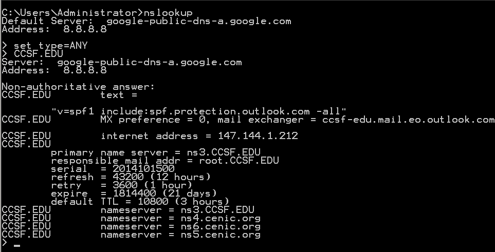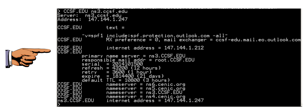 Notice the "primary name server" line in the middle of the output. That's the authoritative name server for the CCSF domain.